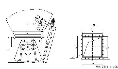 鄂式閘門主要由閥體、閥軸、扇形閥板、銷齒齒輪及曲柄機構、電液動推桿或(電動推桿、)組成,采用優質鋼板焊接結構、具有體積小、重量輕、阻力小。工作時,電液動推桿的直線往復運動,通過曲柄帶動閥軸齒輪,使兩個閥板作相對角度的擺動,從而達到控制物料之目的。