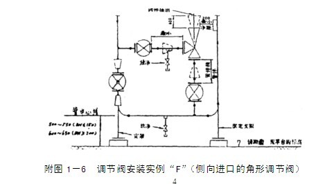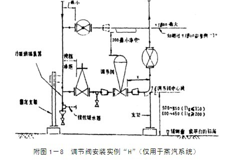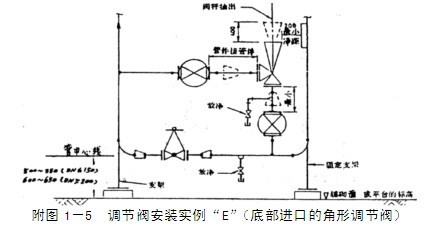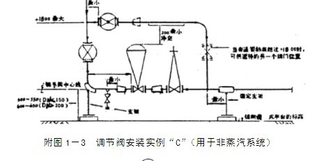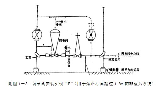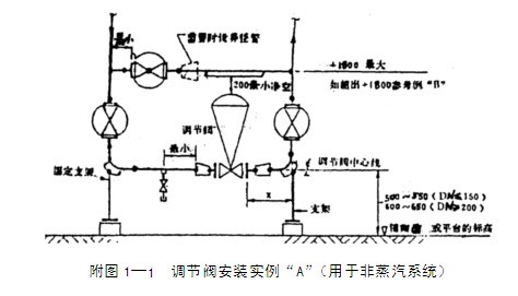 二、在工藝條件許可的前提下切斷閥安裝在立管上可以縮短調節閥組的長度,見附圖1-1。這種配管型式是最常用的。切斷閥的標高一般為1.2~1.3m為宜。