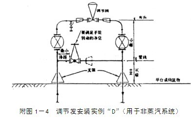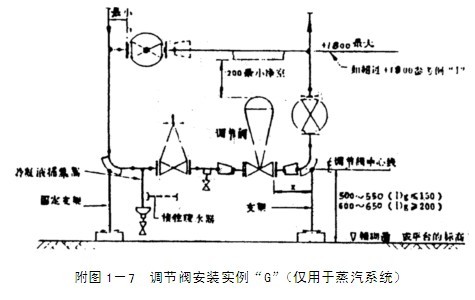 三、在位置許可的情況下,同時又符合工藝條件時,一般可將上游側切斷閥裝在立管上,下游側切斷閥裝在水平管上,見附圖1-3。這種配管型式可使調節閥膜頭與旁通閥錯開,從而降低旁通管的標高。但蒸汽調節閥因上游切斷閥前需設冷凝水捕集管,見附圖1-7,1-8,上、下游側切斷閥安裝位置正與上述相反。這兩種配管都能達到緊湊的目的。