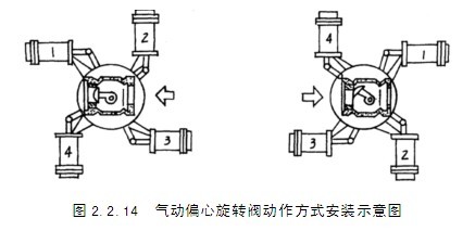 三、使用前必須檢查閥門的流向與管道的流向,閥門的作用方式(氣開或氣關式)與系統的設計要求是否相符。 14、氣動偏心旋轉調節閥(附圖1-10)可根據現場位置或工藝需要按圖2.2.14的可供選擇的4種方位來安裝閥的驅動機構。